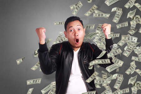 Happy person getting bonus money and banknotes flying in the air and get lucky rich and financial freedom comeliness