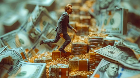 A dynamic scene showcasing flying dollar bills and coins, symbolizing the flow of money and representing the concept of financial prosperity and wealth accumulation.