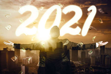 Double exposure of young businessman stretching hands under dollar money falling from the sky with 2021 numbers and skyscraper background