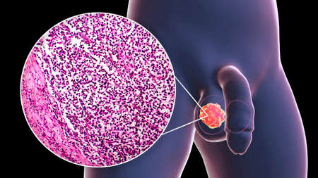 Testicular cancer, testicular seminoma, 3D illustration and light micrograph. Malignant tumor of the testis