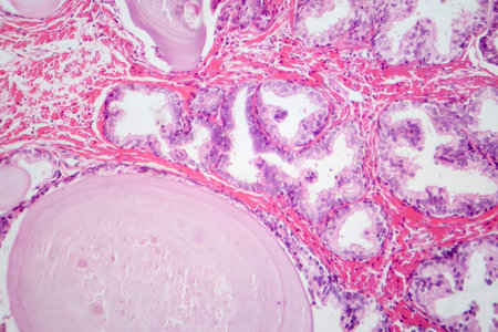 Benign prostatic hyperplasia. Micrograph shows dilated glands, papillary projections inside the lumen of the glands, cystic dilatation with accumulation of secretory material. Photo under microscope