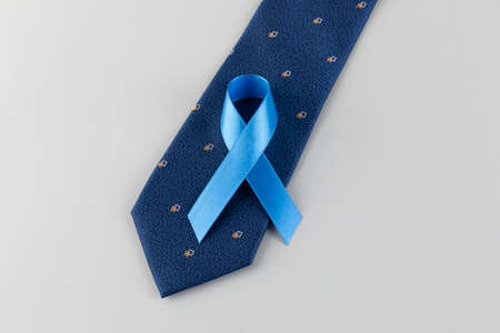 Cancer awareness blue. Blue ribbon, fashion tie isolated on deep blue background. Awareness prostate cancer of men health in November. November and International Mens Day