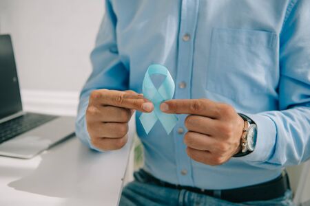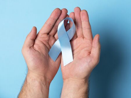 Close-up male hands holding blue prostate cancer awareness ribbon on a bright blue background. Medicine and health care concept