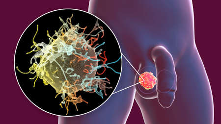 Testicular cancer, 3D illustration showing malignant tumor in the testis and close-up view of testicular cancer cell