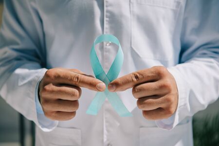Doctor, hands hold a blue ribbon as a symbol of hope, faith. help, medical concept.