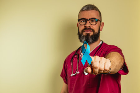 Medical professional demonstrates male reproductive system model while holding blue ribbon for awareness campaign