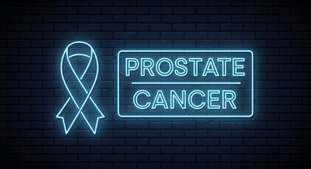 Prostate cancer neon sign. Vector illustration in neon style on brick wall background.