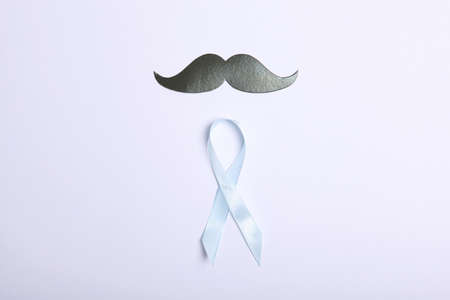 November light blue ribbon with mustache on gray background with copy space, Prostate cancer awareness month, men's health concept