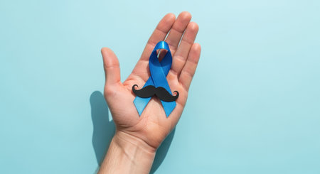 Male hand holding blue awareness ribbon with black mustache symbol on pastel background representing men's health and cancer support.
