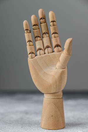 A wooden hand on a blue table