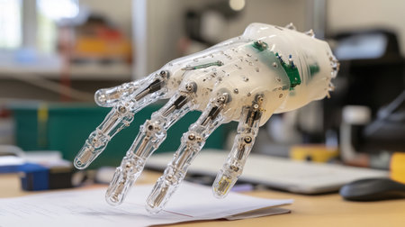 Close-up of a modern, transparent prosthetic hand showcasing design.