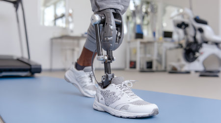 Prosthetic leg athletic shoe rehabilitation physical therapy technology modern medical gym exercise recovery person with prosthetic leg wearing