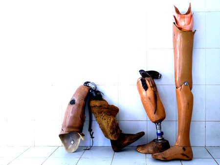 A striking exhibition of various prosthetic limbs, each piece a testament to medical engineering and support for individuals with disabilities.