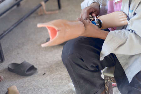 Worker of prosthetic production factory fixing socket covered with silicone liner of leg prosthesis with screwdriver in workshop
