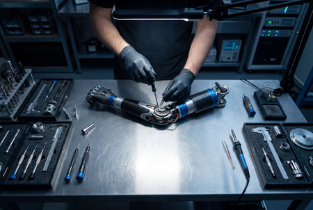 A skilled technician wearing black gloves uses a screwdriver and tweezers to carefully assemble the internal gears of a modern carbon fiber prosthetic arm on a stainless steel laboratory workbench.