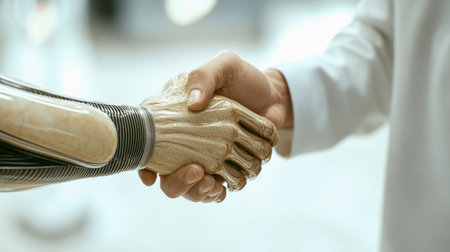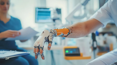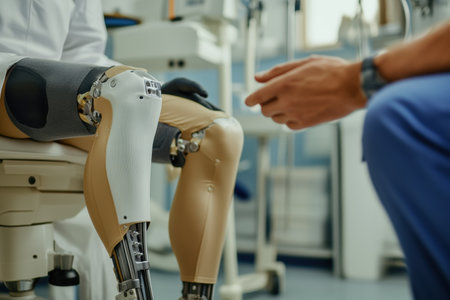 Robotic prosthetic limb in a medical setting during a patient consultation in a clinic