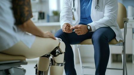 A clinician showcases a prosthetic leg to a patient in a modern medical office, highlighting advancements in mobility solutions.
