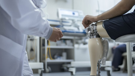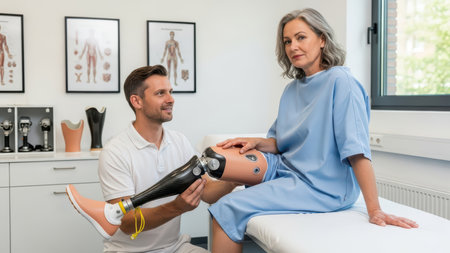 In a clinical environment, a medical professional is showing a prosthetic leg to a patient, emphasizing rehabilitation and support.