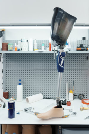 Prosthetic leg design and engineering workspace with tools in modern office. concept of biomedical innovation, precision engineering, assistive technology.