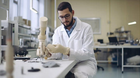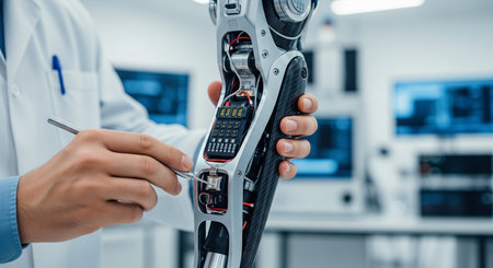 A technician examines a robotic prosthetic arm in a modern research lab during the day