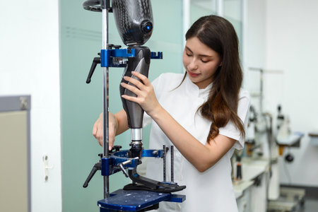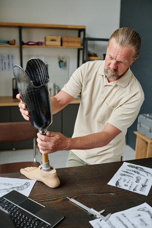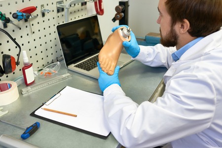 Prosthetic technician holding prosthetic leg checking and controlling