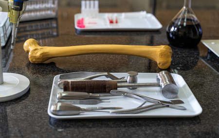 Dental equipment in dentistry laboratory office, close-up. Dental teeth, mouth, gums on dentist technician table