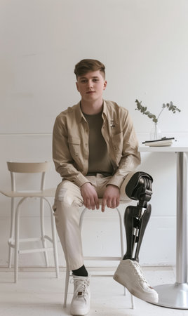 Young restful man with disability sitting by small table in workshop of contemporary prosthetic factory during break