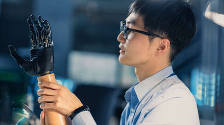Close Up of a Futuristic Prosthetic Robot Arm Being Tested by a Professional Japanese Development Engineer in a High Tech Research Laboratory with Modern Computer Equipment.