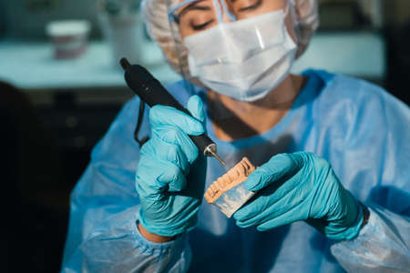 Hands of a dental technician with surgical mask and glasses polishing dentures on his table. health concept