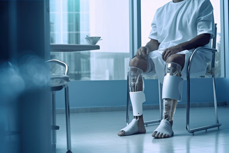 An emotional depiction of a man with prosthetic legs, highlighting the importance of modern medical developments to overcome trauma and return to active life.
