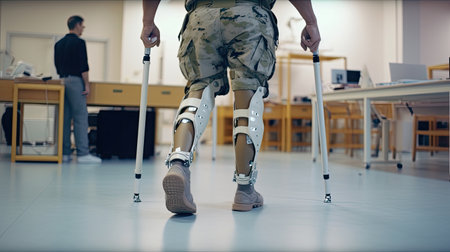 Hospital Physical Therapy , rehabilitation of a patient with a leg injury, a modern medical center , Robotic Exoskeleton Legs , Generative Ai Technology