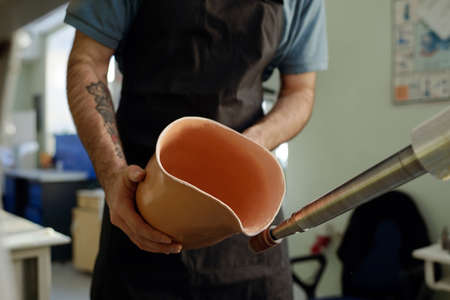Male worker in apron and gloves fixing thermoplastic sheet on top of prosthetic socket while using special metallic piston