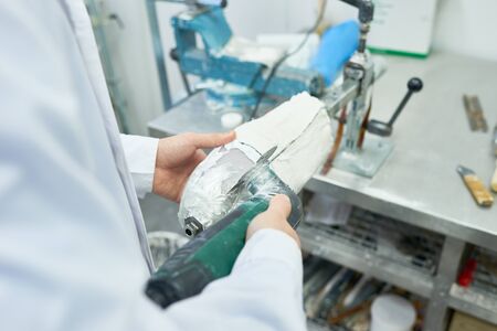 Dentist’ s hands holding a gypsum model in a dental prothetic laboratory. Technical shot.