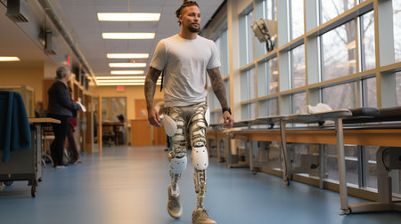 A person with a prosthetic leg walks confidently in a high-tech lab dedicated to advanced biomechanics.