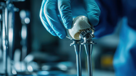 A skilled technician in blue scrubs assembles a prosthetic leg in a comprehensive workshop, showcasing the intricacies of modern prosthetic technology and medical craftsmanship.