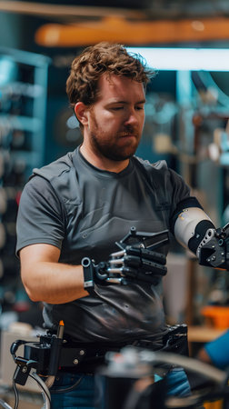 Biomechanical engineer with a prosthetic prototype, motion reimagined
