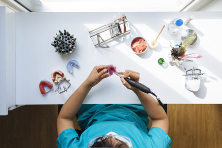 A dental technician in protective clothing is working on a prosthetic tooth in his laboratory.