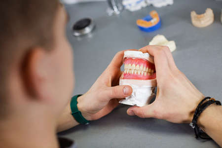 Dentist with a cast deture in his hands in a close up view