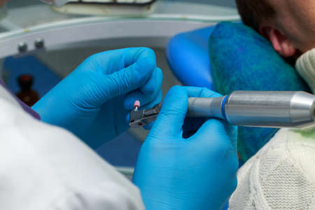 The dentist holds a drill with an implant. Close-up of dental drill use for patient teeth in dentistry office in a dental treatment procedure.