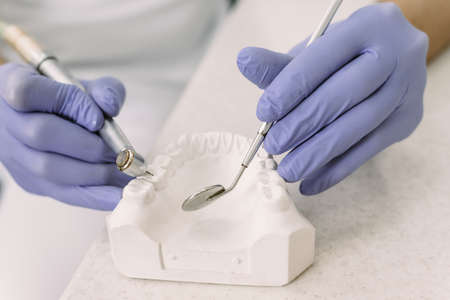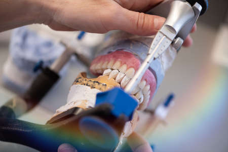 Dental prosthesis, dentures, prosthetics work. Prosthetics hands while working on the denture, false teeth, a study and a table with dental tools.