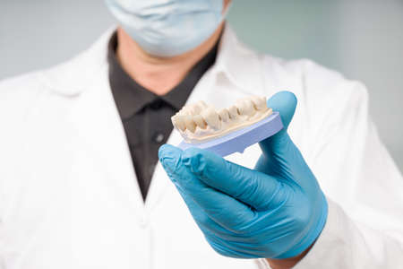 Studio lighting. a man in blue gloves holds a plaster jaw. Close-up