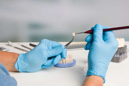 Hands of a dental technician fixing the paste on a dental prosthesis