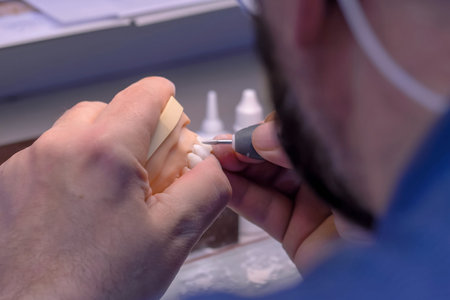 Dental technician using a brush with ceramic dental implants in his laboratory.
