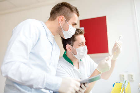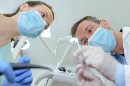 Dentist and assistant at a treatment, from the perspective of a patient. Dentist Holding Dental Tools.