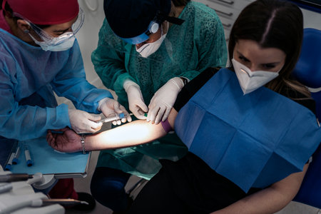 Close-up of the hands of a dentist surgeon on implantation, with dental instrument and surgical template