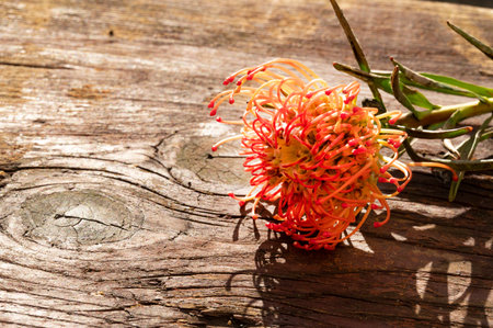 native Australian protea plant with red flower outdoor in beautiful tropical backyard shot at shallow depth of field