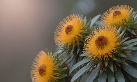 native Australian Banksia spinulosa Birthday Candle plant with yellow and re flowers outdoor in beautiful tropical backyard shot at shallow depth of field