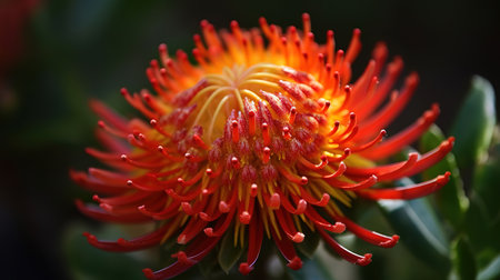 Close up of red orange flower head of a leucospermum in the garden. Generative Ai
