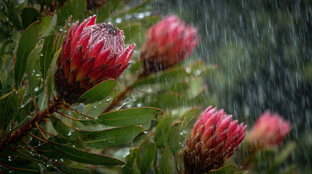 Protea in a storm, heavy rain pouring down, strong winds twisting their leaves