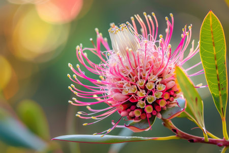 native Australian bush plant isopogon candy cone with pink flowers shot at shallow depth of field
